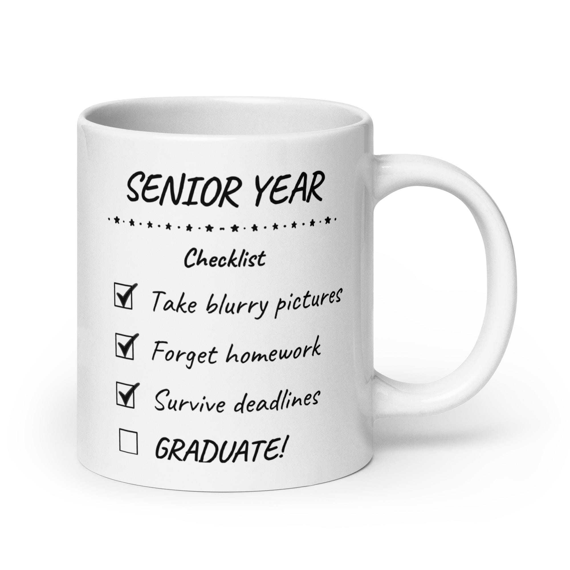 Whether you’re drinking your morning coffee, evening tea, or something in between, this Senior Checklist white ceramic mug is the perfect companion for senior year. Designed to celebrate milestones, memories, and the countdown to graduation, it makes a thoughtful graduation gift for high school or college seniors.